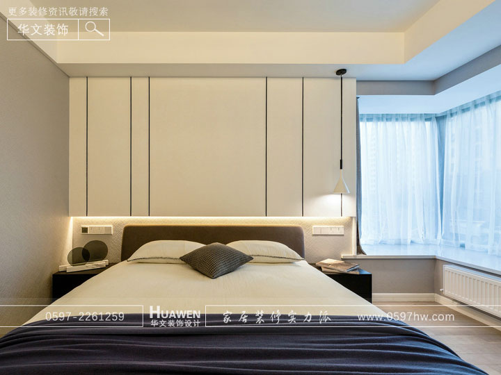 ▲ 主卧设计师将背景墙用石膏板做抽缝处理,低造价却又能达到出彩的效果,灯带也为空间增色不少,简约不失格调。