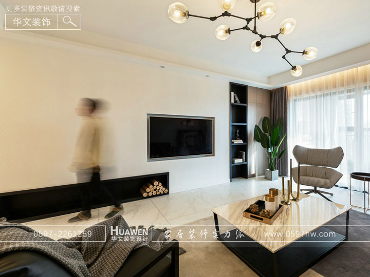 ▲ 软装家具与通道保持适当距离以保证空间动线流畅,电视背景墙错落的壁龛增加收纳性的同时也提升了空间设计感,原木色柜门与绿植传达环保的生活理念。